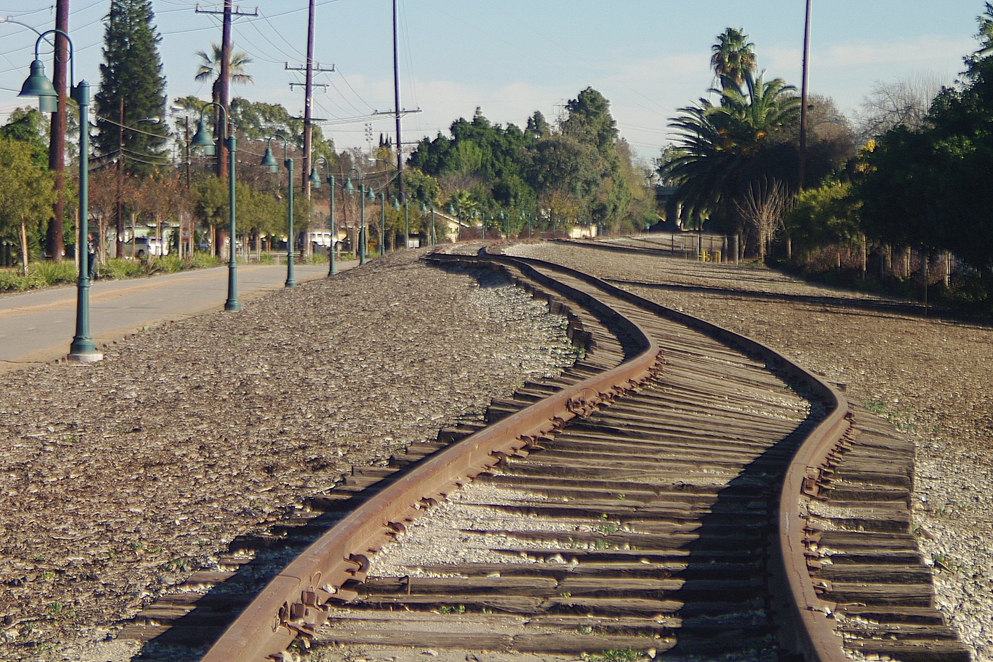 THE BIG RED CARS OF THE PACIFIC ELECTRIC RR (aka PE) USED THIS LINE TO REACH SANTA ANA, Ca. THIS A RECENT PHOTOGRAPH OF THE LINE EAST OF BELLFLOWER, Ca.