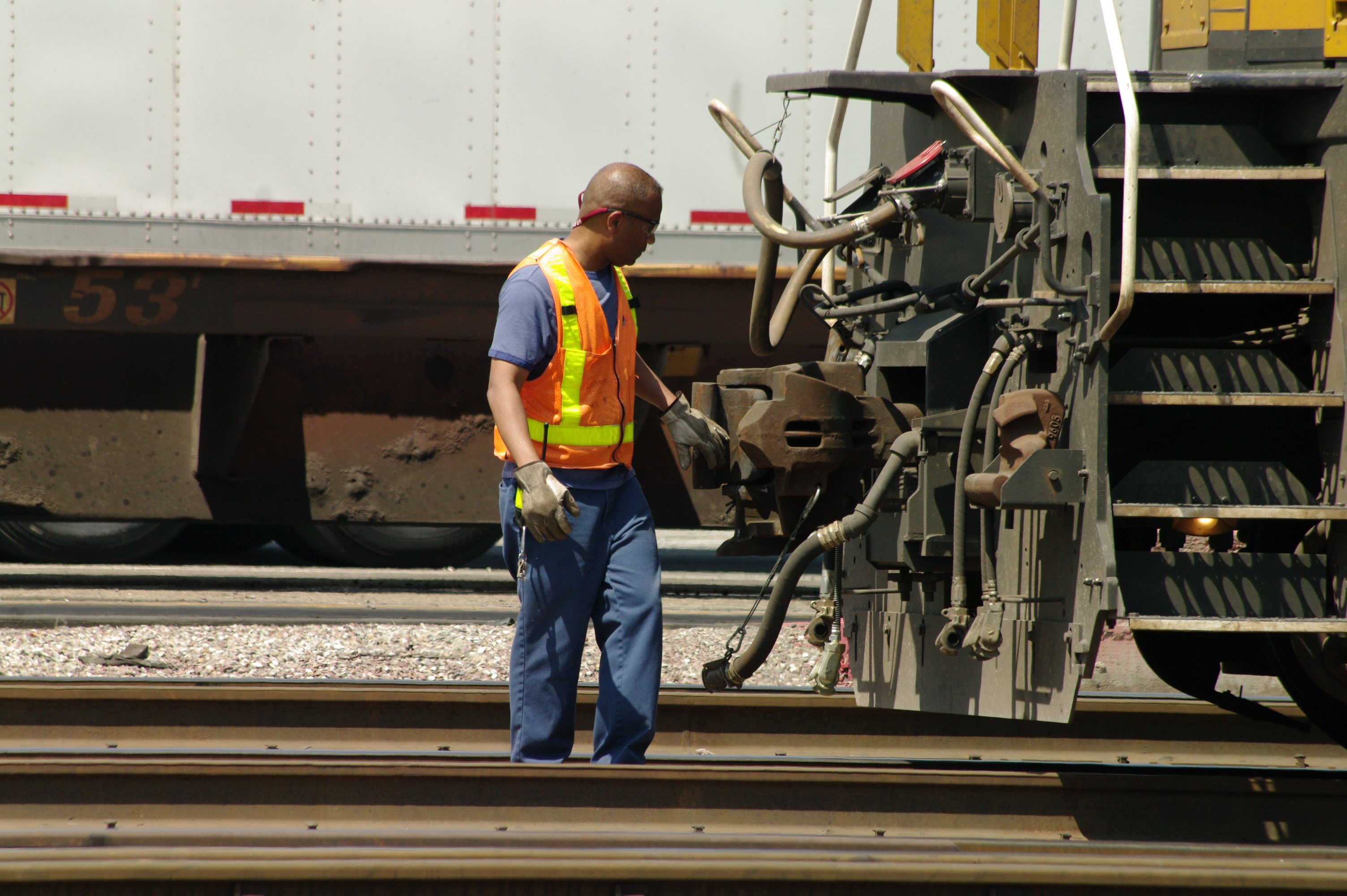 OPENING THE KNUCKLE; NOTE THE WIDE GAP BETWEEN THE LOCOMOTIVE AND CAR FOR SAFETY OF SWITCHMAN